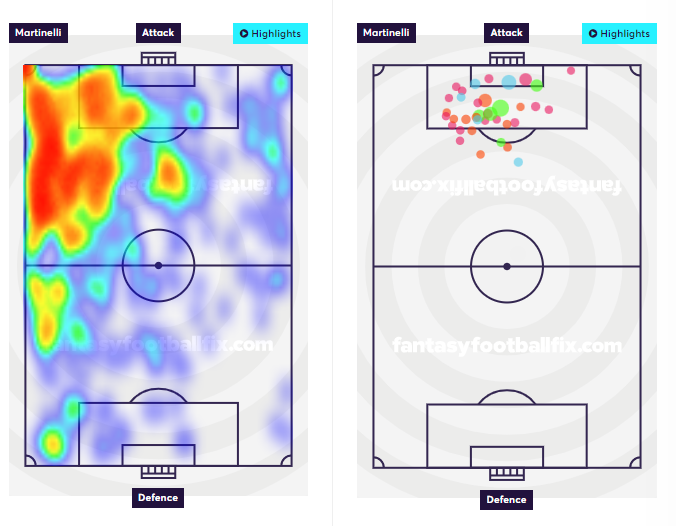 Aston Villa have an apparent weakness down their left-hand side. They have conceded 30% of their goals through that side. No side has conceded more percentage of chances down that wing. As we can see from the above graphic, that is exactly where Martinelli operates. The Arsenal man will be looking to exploit the weak point!
