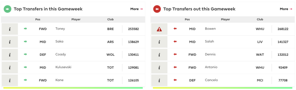 This week, we can see the transfer trends show people buying players from Brentford, Arsenal, Wolves, and Spurs. The top 5 transfers OUT come from West Ham, Liverpool, Watford, and Man City.