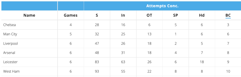 Chelsea play Brentford at home in GW31. Among all teams in the last 6 gameweeks, Chelsea are best for shots conceded, shots on target conceded, shots in the box conceded, and big chances conceded.
