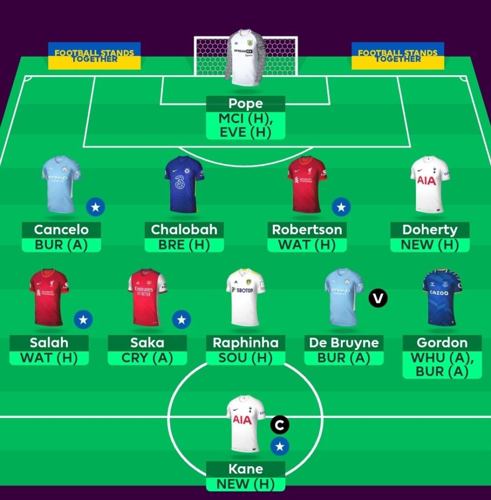 Salah is a no-brainer in the squad up against a leaky Watford side. The midfield has another premium pick, this time a differential in the form of Kevin De Bruyne at just 7.5% ownership. KDB should be the rotation free City attacker given how close Liverpool are chasing Manchester City and how important KDB is. Raphinha and Saka are both back and fully fit after returning from COVID against Southampton and Palace, who are not that great defensively. Midfield is completed by Gordon who is great enabler(4.5) and also has a Double Gameweek against West Ham and Burnley. Added bonus is that he is on some set pieces too!