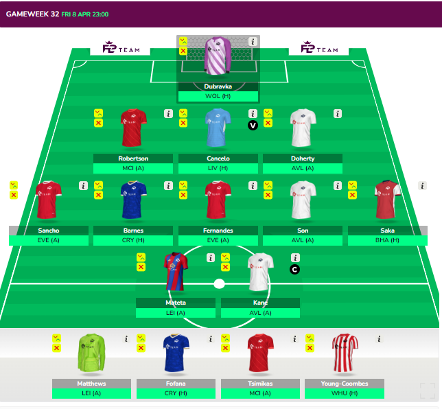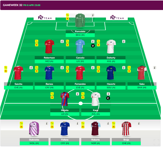 - Fernandes and Sancho are good punts for GW32 and GW33 Double and can be removed after GW33 for De Bruyne/Salah and Havertz/cheaper mid.