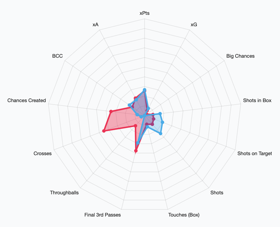 Newcastle, on the other hand, have conceded 9 goals, only keeping 2 clean sheets. Everton have an xGC of 1.74, and Newcastle have an xGC of 1.38. With Maddison’s 57% goal involvement, Leicester’s high chances of getting a goal in the double could mean Maddison is involved in some way or another.