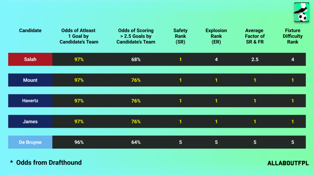 Mount(9) and James(9) finish on top and are the best captaincy options ahead of GW34 as per the metrics. Havertz(10) runs them close but Mount(9) and James(9) finish above Havertz with a CRF difference of 1. Salah and KDB surprsingly finish 4th and 5th on the metrics largely due to the Single Gameweek fixtures compared to Chelsea’s Double Gameweek fixtures.