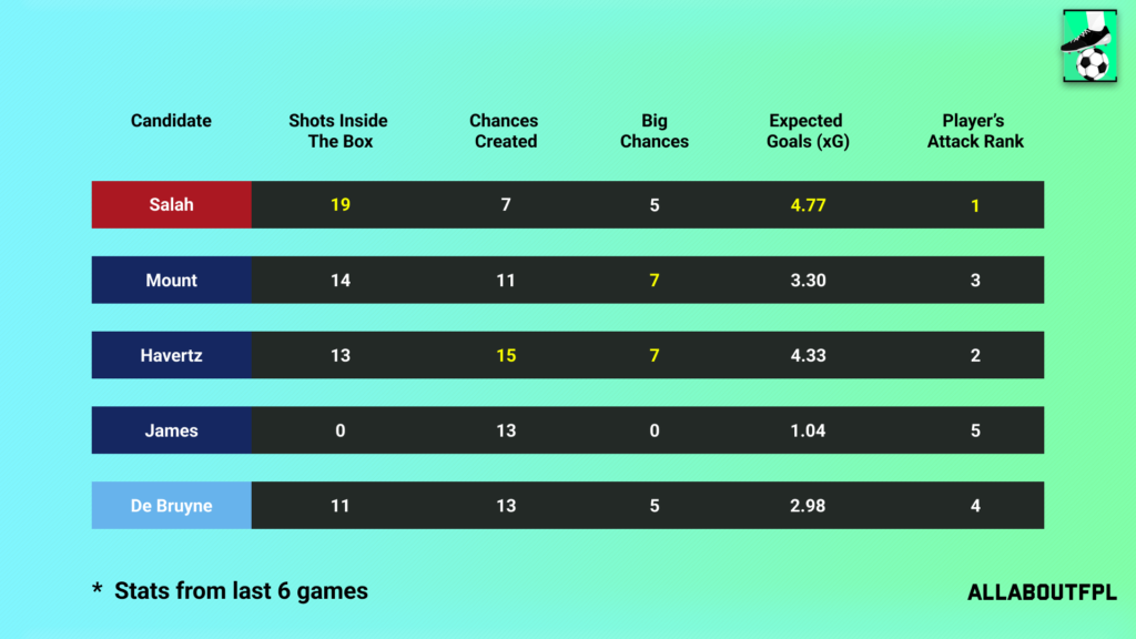 As expected, Salah tops the underlying numbers for yet another week with an impressive xG of 4.77. Havertz is second with an xG of 4.33. Mount and KDB are close with Mount slightly above in xG compared with KDB and ends up third whereas KDB is fourth. It’s always tough for a defender to compete with attackers in this half of the metrics and James comes last.