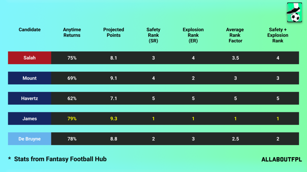 Mount has the second-highest projection of 9.1 points and is third overall for safety and explosion rank. Havertz meanwhile ends last even though he has decent numbers which however isn’t close to the other four options.