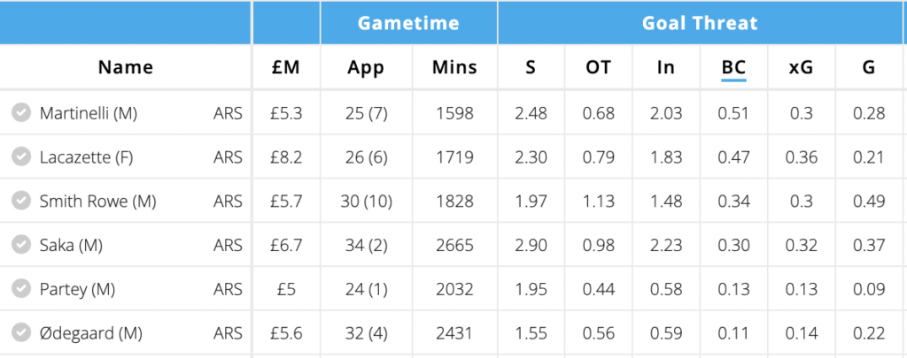 Martinelli has played considerably less number of minutes when compared to some of his compatriots. As a result of which it makes more sense to look at the per 90 numbers. The Brazilian is top for Big chances per 90 among his teammates. He is also second only to Saka for shots and shots in box. We can therefore say that when Martinelli plays he is one of their biggest threats in front of goal.