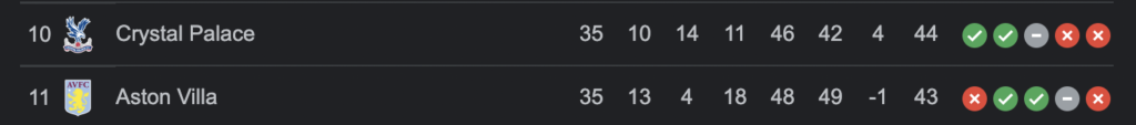 Palace and Villa go head-to-head and are fighting it out for a spot in the top half of the table and currently are separated by only one point.