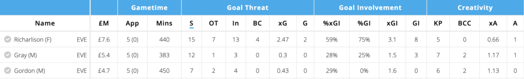 If you have the budget, the second option from Everton you could look at from the Everton attack could be Gray over Gordon. He’s played all games from GW33, and during the period his numbers are pretty similar with Gordon.