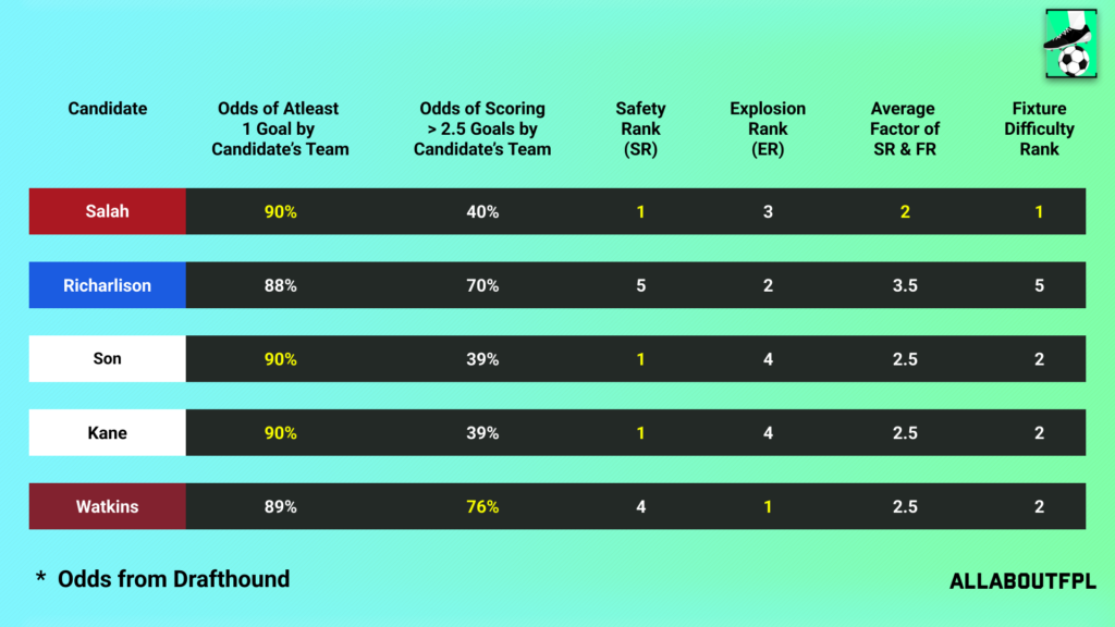 Although Everton and Villa double the odds of one goal at least is dominated by Spurs and Liverpool considering how bad Burnley and Saints are defensively. Aston Villa dominates the odds of scoring 2.5+ goals with a 76% chance of scoring 2.5+ goals, Everton are second with a 70% chance of 2.5+ goals. In the end, Salah tops the fixture difficulty rank with Son, Kane, and Watkins third. Richarlison finishes last in comparison with the other four picks.
