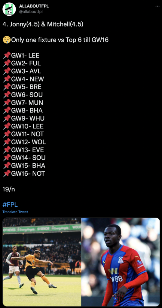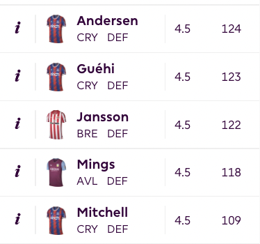 The palace defenders dominated the 4.5 million price point last year and yet did not get a price raise this year. Andersen is a good goal threat, Guehi is a bonus points magnet and Mitchell has good attacking potential. Their fixtures are not easy, to begin with but they do rotate really well with Wolves and Newcastle.