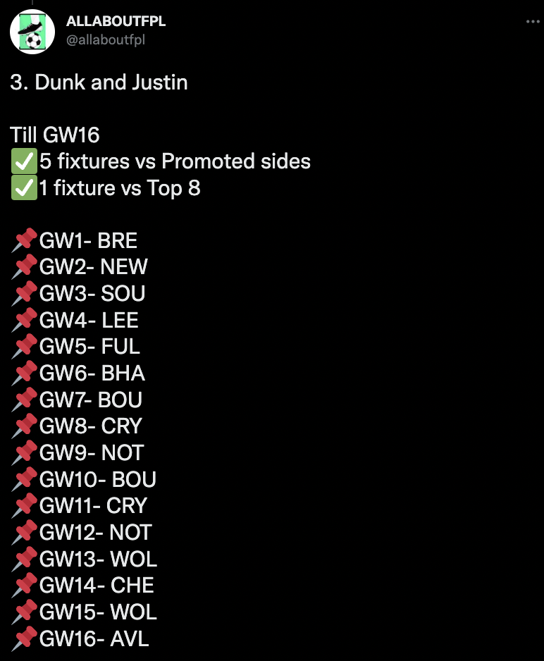 Brentford’s defence rotates really well with Aston Villa, if you get a villa defender Digne/Cash you can rotate them and play one to avoid the top eight till gameweek 16 and play six promoted teams during the period!