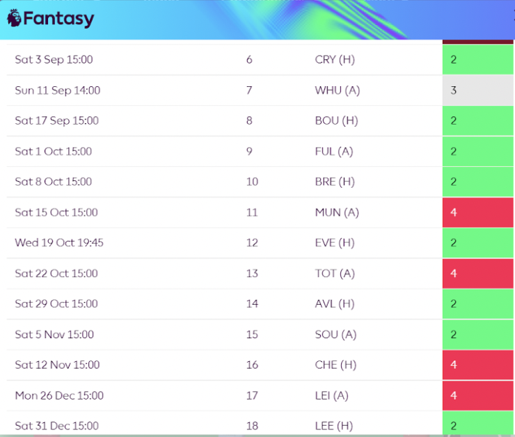 Newcastleโs fixtures have fallen this season in an interesting manner. There is not an obvious period of games where you have to avoid Newcastle players but also not a run of 8+ games of favourable fixtures. This could see Newcastle assets as long-term holds within your squad where potential rotational pairings could really work well and help save budget.ย ย