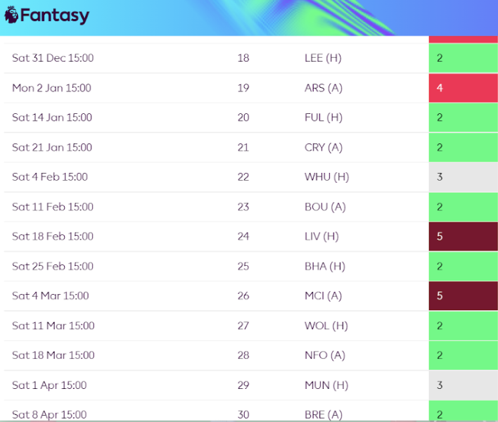 From Gameweek 18-23 Newcastle have a similar set of fixtures with 1 difficult game, on paper versus Arsenal, in a run of six fixtures. This set of fixtures come just after the world cup and the unlimited transfers which therefore could be the optimum time to jump on the Magpies.