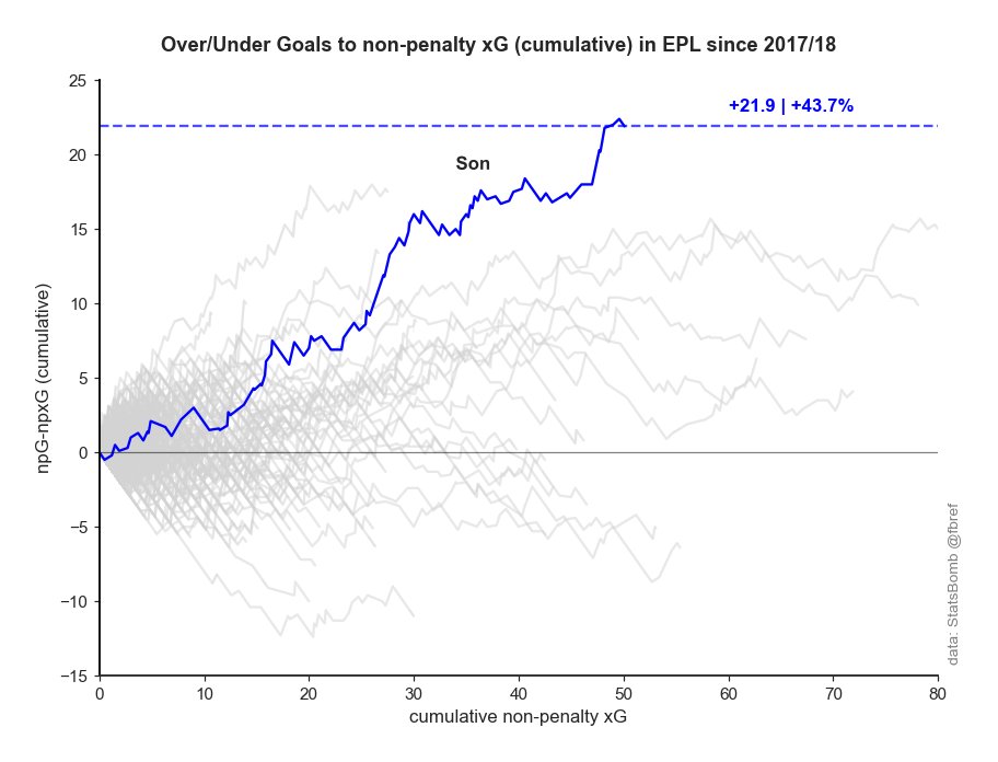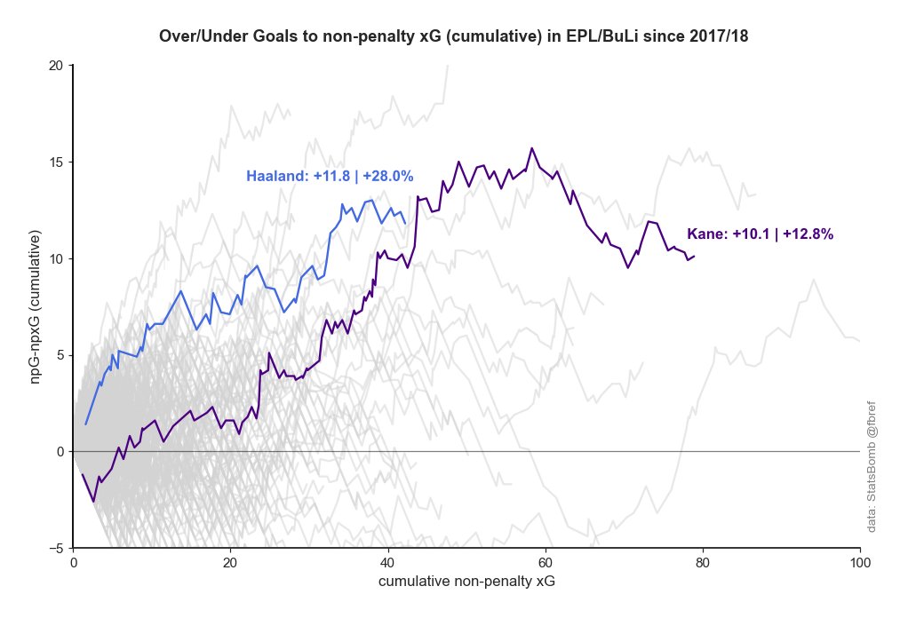 One of the most impressive aspects of Haaland’s game is his xG overperformance. As Premier League fans, we are aware of the staggering overperformance of Son, but Haaland has a potential to be almost as good. In his Bundesliga career, Haaland had an xG overperformance of +11.8 (+28.0%). In comparison, throughout their Prem careers, Son has an xG overperformance of +21.9 (+43.7%) and Kane has an xG overperformance of +10.1 (+12.8%). Especially when we expect any City attacker to have elite expected stats, Haaland’s overperformance could produce some mind-boggling results. For reference, between 17-18 and 20-21, Aguero had an overperformance of +6.9 (+15.0%).