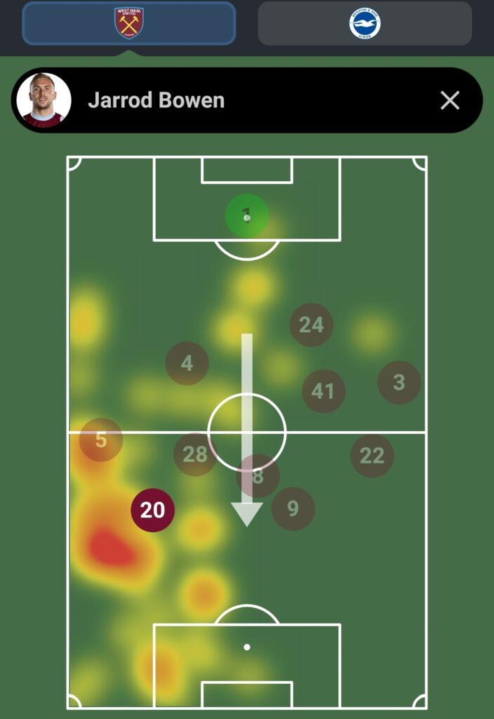 He had 3 shots and 1 key pass for an xG of 0.15 and xA of 0.08 from their weekend fixture against Brighton, hardly numbers to write home about. However, he looked in good positions per the eye-test and heat map from the game, shown below, backs this up with decent presence in the penalty box. Up next, he has an Aston Villa side who’s looked defensively suspect this season who play with their fullbacks pushed high up the pitch. This might create the room and opportunity for Bowen to get his first FPL return of the season. If you’ve owned Bowen through these 3 gameweeks, I’d encourage you to give him one more game and look elsewhere to use a transfer this week (or save it!) as instinct tells me he’ll have chances this gameweek.