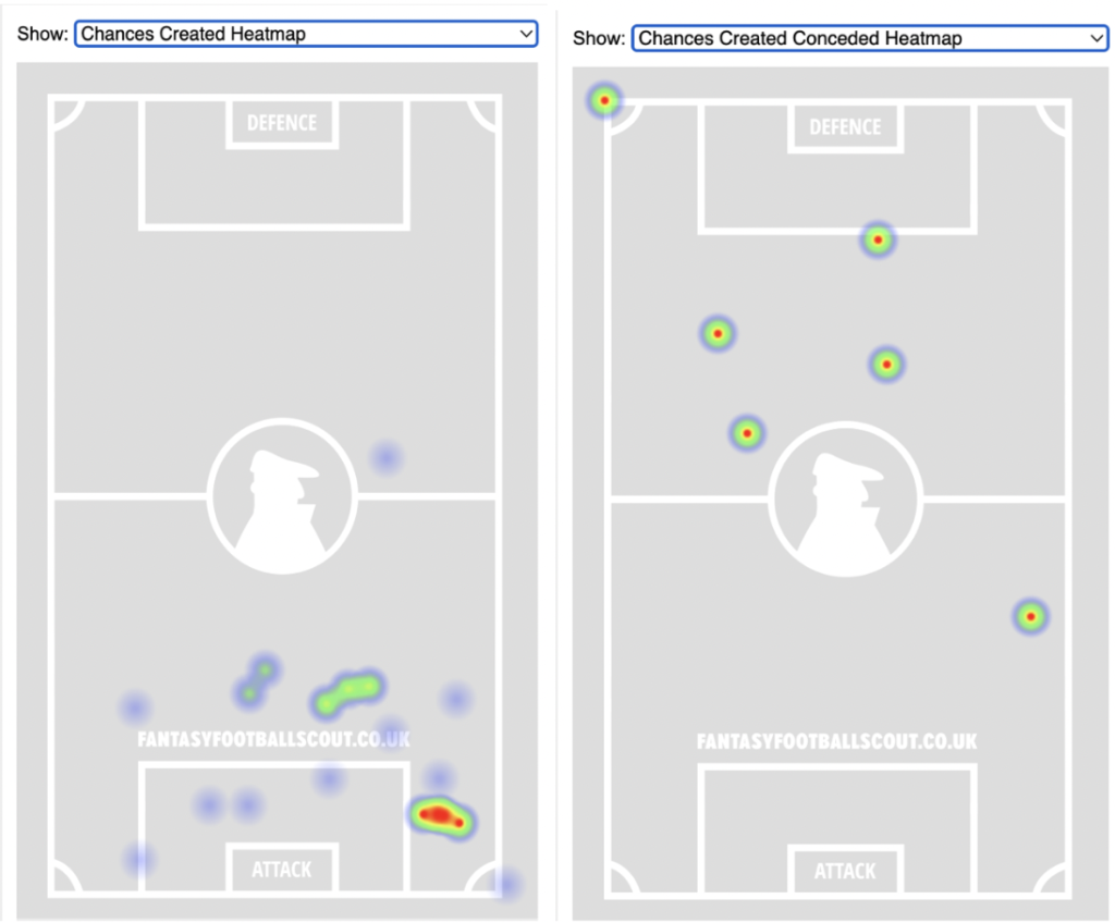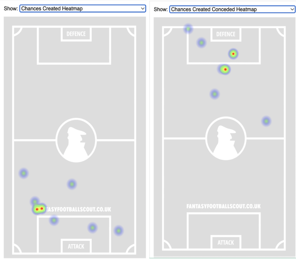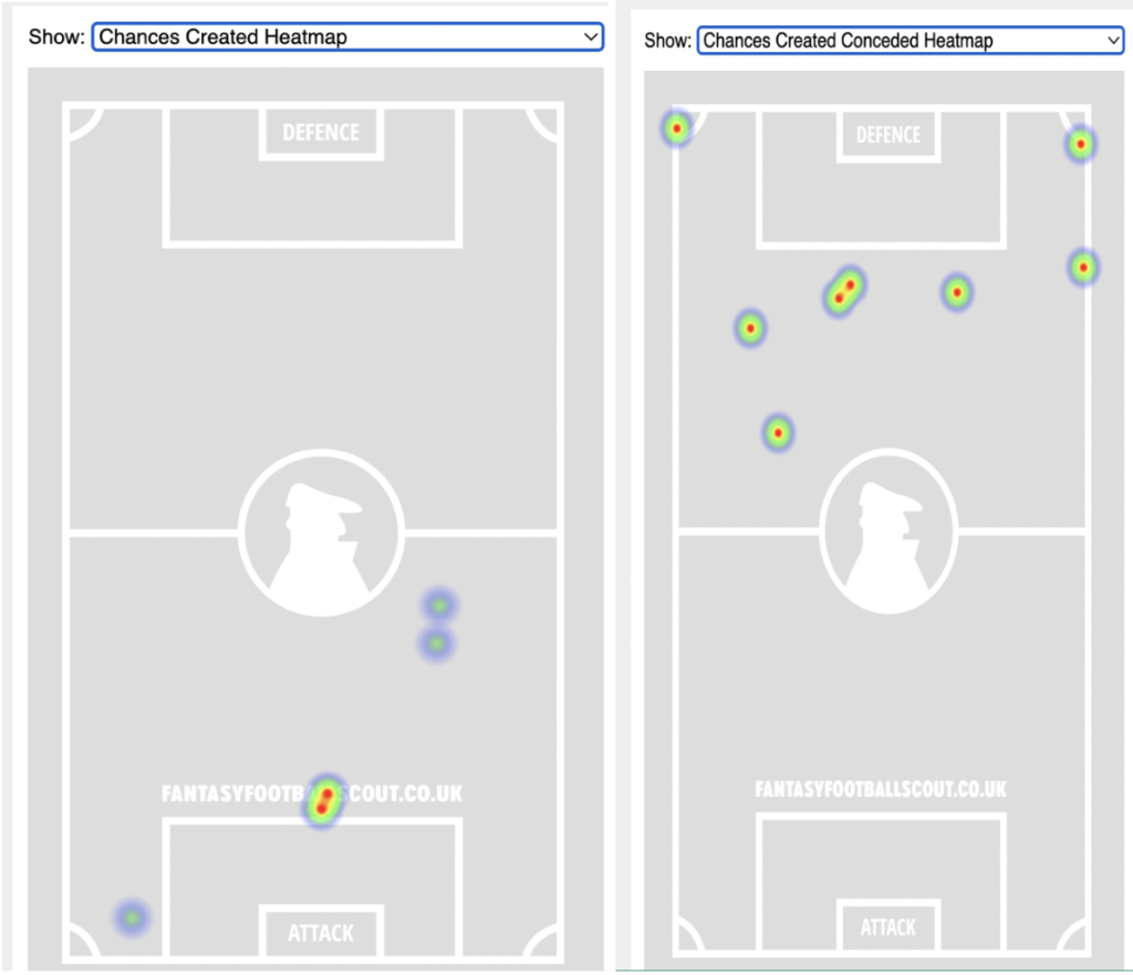 Bournemouth perhaps delivered the biggest upset in GW1 as they comfortably beat Aston Villa 2-0. Midfielder Marcus Tavernier (£5.0) was the main source of creativity for the Cherries as he finished the game with three chances created. Defensively, Bournemouth was compact inviting Aston Villa’s pressure as the heatmap of their Chances Conceded is pretty balanced. This could spell trouble against Manchester City in GW2 as they will be on the front foot all game if Bournemouth invites the pressure. I expect this to be the case, making it hard to trust any Cherries’ fantasy assets.