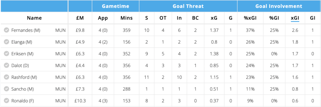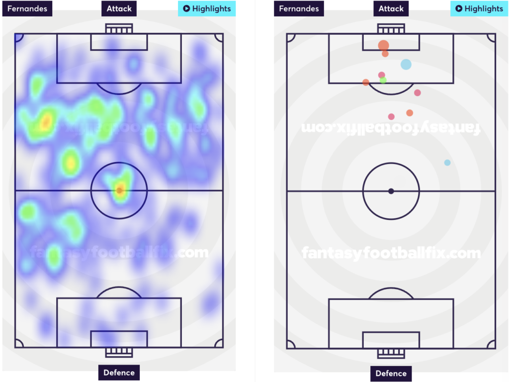 He’s been occupying positions just outside the box and making late runs into the box which can be seen from the heatmap and shot map above. No Man United player has a better xGI than Bruno who has an xGI of 2.6, which is also 9th best amongst all midfielders. The numbers are surely going to improve with a game against Leicester who have conceded the second most goals in the league so far with only Bournemouth worse than them.