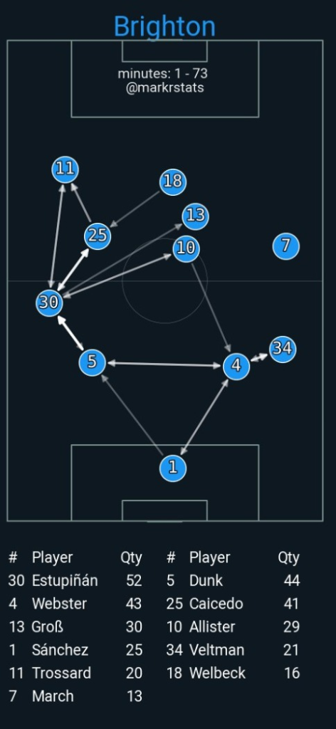 This week, Brighton’s new left-back Pervis Estupinan is the ultra differential pick. Estupinan has settled in well and has been vital for Brighton’s attack as he releases Trossard. The average position and pass map below further explains the vital connection between Estupinan(30) and Trossard(11).