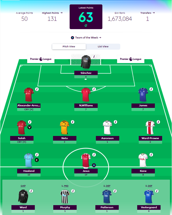 Former PL star Micah Richards has got 63 points and 7 of them came from Neco Williams who was impressive in Forest’s first PL victory after being promoted. He’s still got Salah and TAA so a strong finish is on the cards!