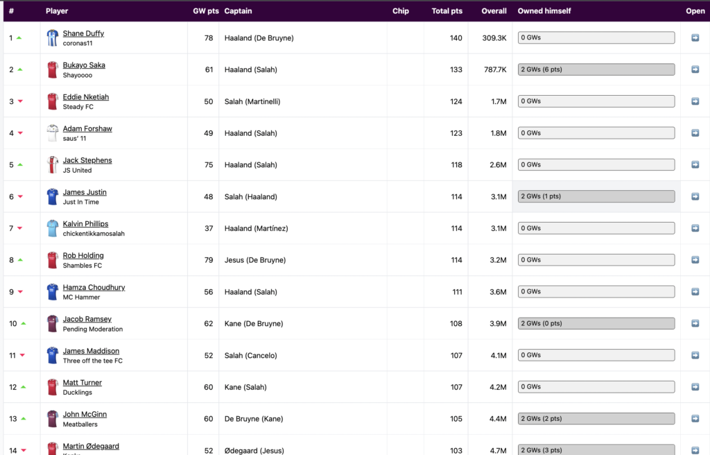 Duffy recently moved to Fulham on loan and has done well himself so far with 78 points with a triple Man City attack of Foden, KDB, and Haaland amongst the points. He’s however got only Diaz from Liverpool with no Salah or TAA, a very interesting strategy indeed.