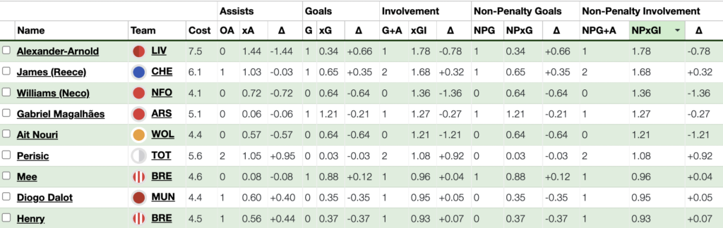 Trent Alexander Arnold and Reece James are automatic choices with TAA playing Everton a fixture that him and Liverpool have dominated over the recent years. Reece James missed the midweek game vs Southampton but should be back for the West Ham game. The duo top the NPxGi involvement amongst defenders so far this season.