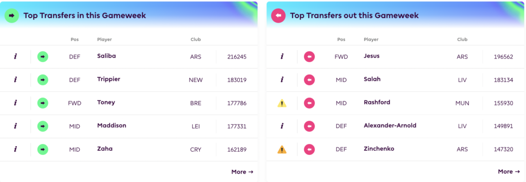 The most transferred-in player ahead of GW9, as of now is Arsenal’s defender Saliba, with almost 216k managers bringing him in. Even though Saliba is the highest-scoring defender in the game, it is to be noted that Arsenal have Tottenham, Liverpool, and Blank in the next 3/4 games. So we would not suggest to bring him in. After him, Trippier and Ivan Toney are in the list of the Most Transferred in players.
