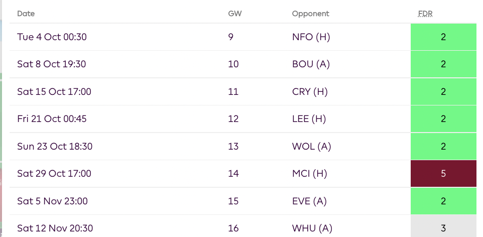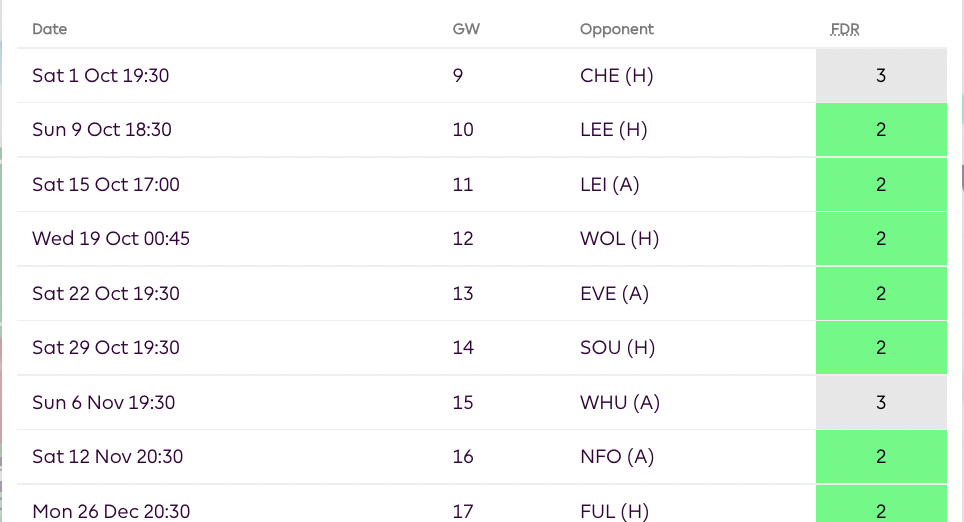 Leicester have amazing fixtures all the way up until the PL halts for the World Cup. They have Bournemouth, Palace and Leeds after facing Nottingham Forest in GW9. All of these fixtures are good enough for Leicester to turn things around, and Maddison to contribute a larger share in it. Therefore, it’s worth taking the risk on Maddison this week.