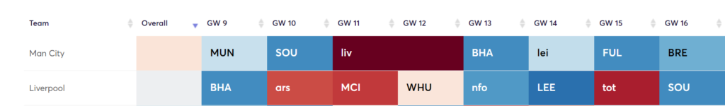 - Liverpool ~ Tough three games from GW9 to GW11 vs Brighton, Arsenal, and Man City but the fixtures turn after that.