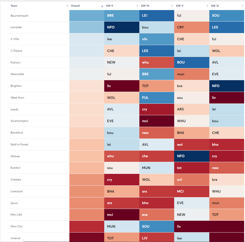 The upcoming period is going to be a crucial one for FPL managers. After a fairly tedious start of the season due to a select few players performing, the template is slowly changing. Many will have recently wildcarded and others will be wildcarding this week. Whether you’re on wildcard or not, the fixtures will play a major part in deciding your transfers for the short-term future. As such, we’re going to look at which teams have the best run and the players to target from those teams from FPL Gameweek 9- Gameweek 12.