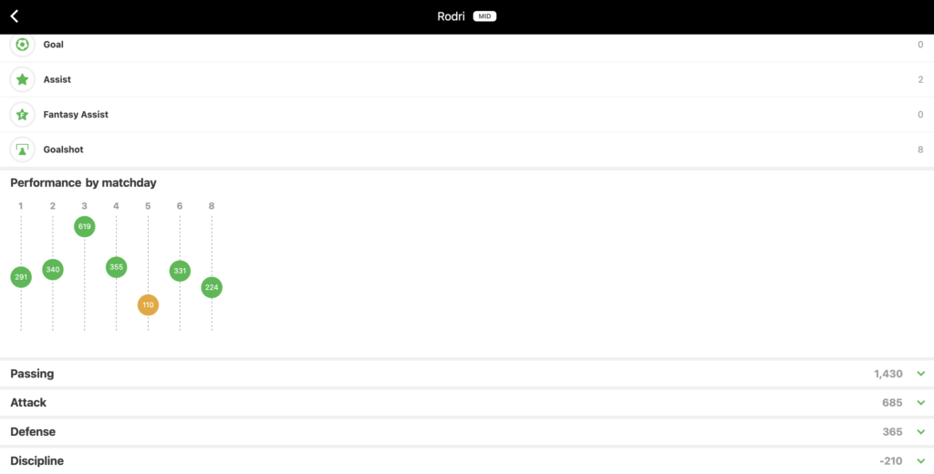 One of Rodri(₵180) or KDB(₵200) is always an essential in SPITCH as they are consistently amongst the top points scorer each week. KDB tops the points scored amongst midfielders till matchday 8 with a whopping 2486 points with Rodri registering 2270 points so far, Rodri offers points from multiple routes as seen below which makes him a great option even when Man City play tougher teams like Man United in Matchday 9. In four out of the 7 matchdays, Rodri has scored more than 300 points which makes the Mr. Consistent SPITCH asset.