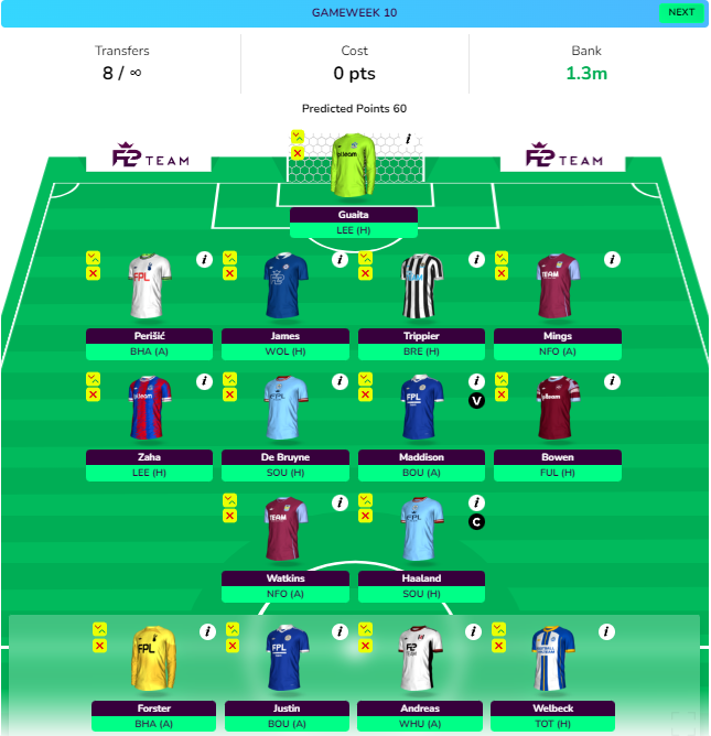 First things first, There will be unlimited transfers for all managers after GW16 due to the World Cup Break. With most managers already using the Wildcard in GW8/GW9, there is not much room to use the use the Wildcard other than the obvious one in GW13 when there is a fixture swing. However GW10 is not at all a bad option to use the Wildcard if you already don’t have players like Zaha, Maddison, James, Haaland, etc and don’t want to take big hits. In this article, we analyze the fixtures from GW10, players to target in Wildcard and pick 4 different drafts which should give you the idea to pick a FPL GW10 Wildcard team.