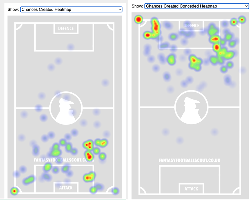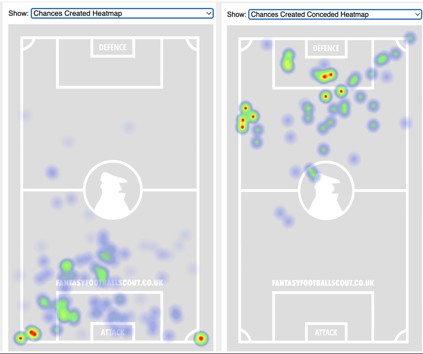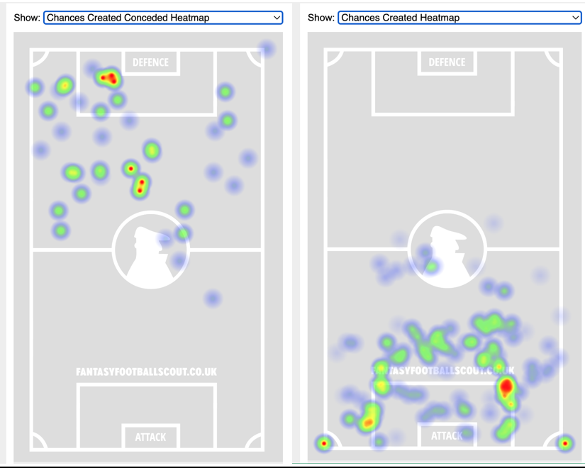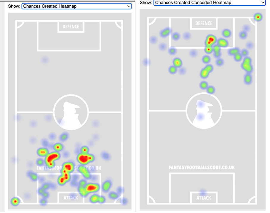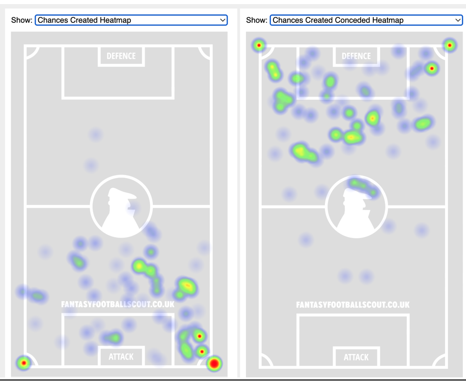 - Defensively, Arsenal struggle defending the left flank as they allow the most crosses and chances from that flank.