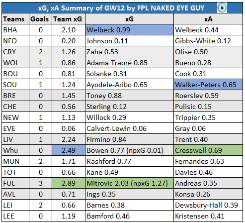 Welcome to the GW12 review with xG, xA analysis and short notes on different fixtures. There are some popular faces and some new faces in this week’s xG, xA list. Let’s dive in. With such a short turnaround for GW13, this article will be helpful to get an overview of the GW12 games.