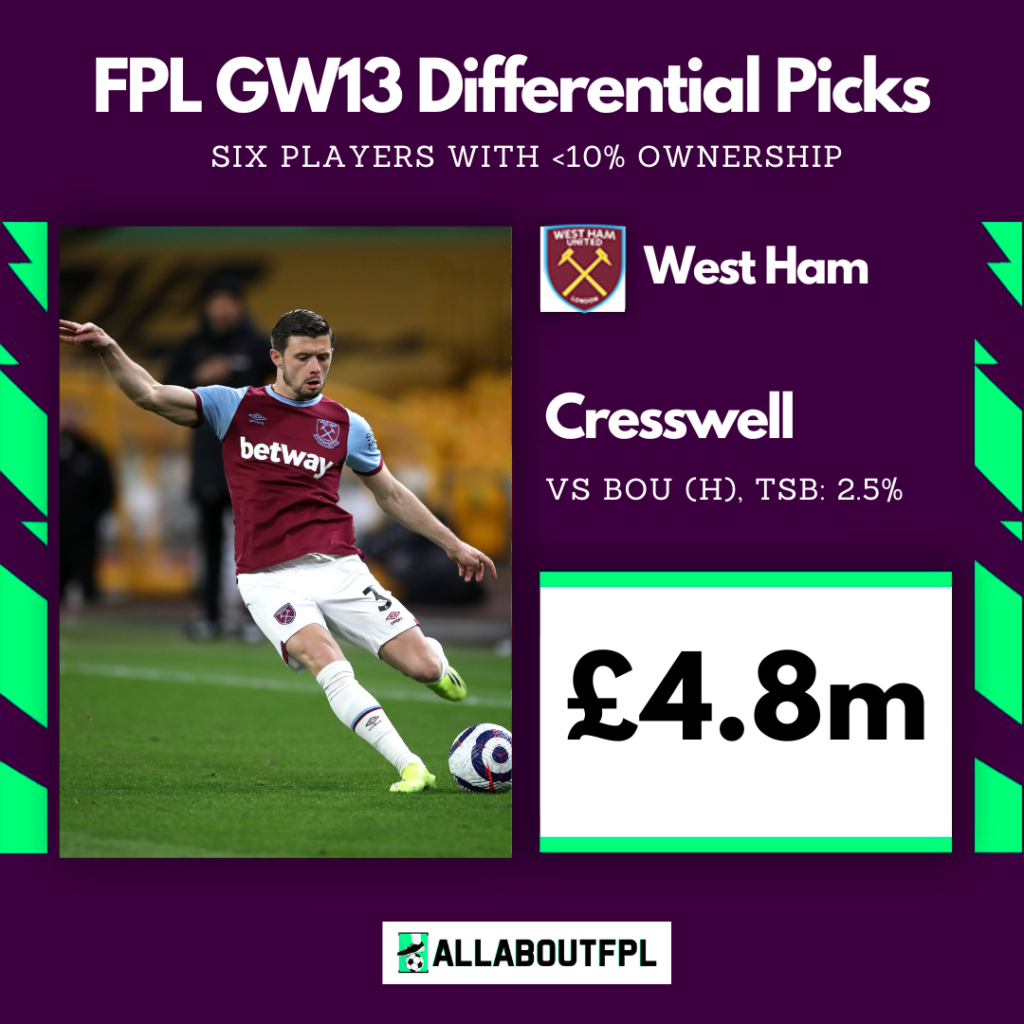 Aaron Cresswell vs Bournemouth(H), £4.8, TSB: 2.5%