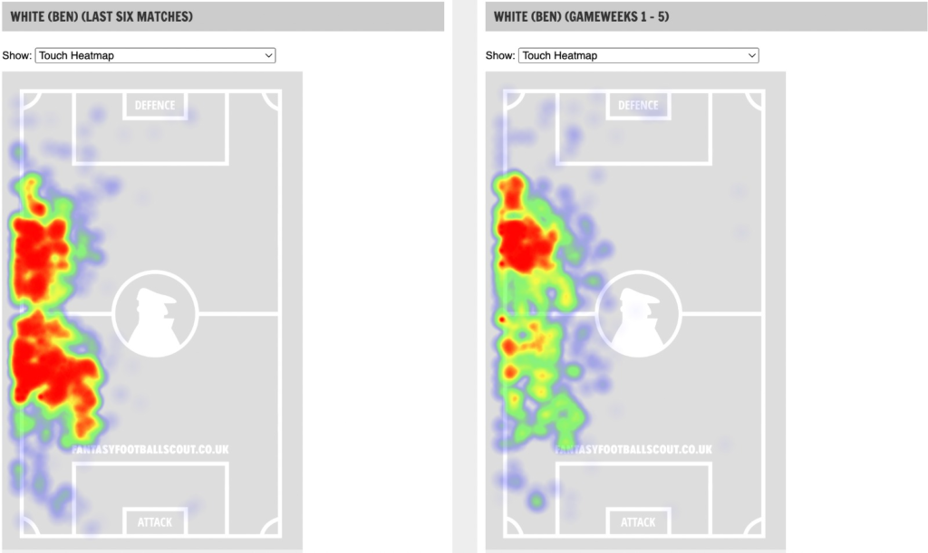 White started the season as a RB and has now made the spot his own after some good performaces. In fact, he has grown in confidence and has began to take up more attacking positions in last few weeksas seen in below heatmaps.