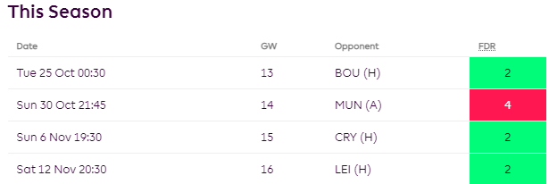 Arsenal and White have good fixtures in the coming till GW16 World Cup break. Their opponents attacking numbers and rank are really bad, which means White could get returns in both sides of the pitch.