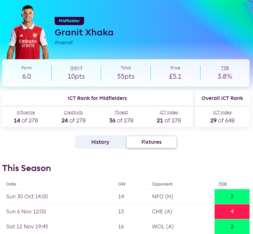 Thanks for reading the ‘FPL GW14 Player in Focus: Granit Xhaka‘ blog. Keep checkingย allaboutfpl.comย for regular blogs and updates. Also, follow ourย 110,000+communityย onย Instagram,ย Facebook,ย andย Twitterย to stay updated on regular Posts and FPL updates. Link to all our FPL Gameweek 14 blogs. Our blogs cover a wide range of topics including the best wildcard team, chip strategy, differentials, and more.