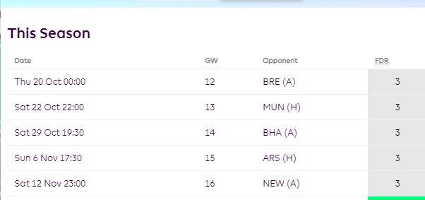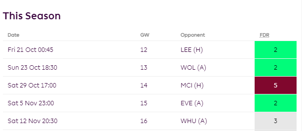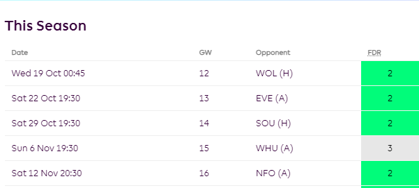 After being suspended in GW11 vs Leeds, Maddison will face Wolves(A), Manchester City(H), Everton(A), West Ham(A) till GW16. To put in simple terms, 3 away games and a game against best defense in the league(Manchester City) don’t look good for 19th placed Leicester side who are struggling this season.