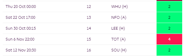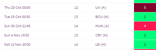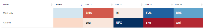 After GW12, Trossard faces Manchester City(A), Chelsea(H) in GW13-GW14 which are tough games. You could go to Saka/Foden from GW13-GW16 when both City and Arsenal have a great run of fixtures as seen below.