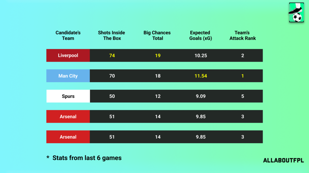 For the first time, this season Haaland doesn’t have a huge difference with the 2nd best player based on individual numbers. Kane is nearly matching Haaland with a xG of 4.18 just 0.2 short of Haaland’s tally of 4.38 in the last six games, both of them have the same number of big chances as well.
