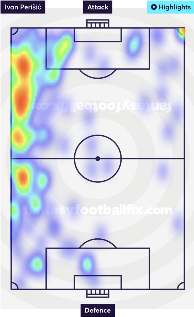 The touch heatmap for Perisic and Dalot, since GW9 shows Dalot’s presence increasing in the more central area of the pitch and advancing as well. While United being solid defensively, he is also seen taking more touches in the opposition’s half. However Perisic’s involvement has been seen reducing lately.