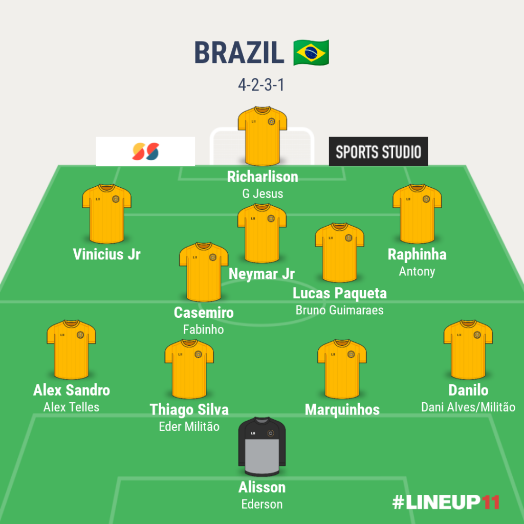 There are chances that Brazil may lineup in a 4-3-3 formation with Fred, Casemiro and Paqueta in midfield and Raphinha, Richarlison & Neymar as front three.