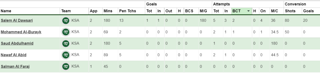 After upsetting Argentina in Matchday 1, Saudi Arabia lost to Poland in MD2 but looked good in attack and very unlucky not to score. Salem Al Dawasri is their main man and tops all the charts for his team like Big Chances(2), Penalty area touches(13) and Shot on Target(5).
