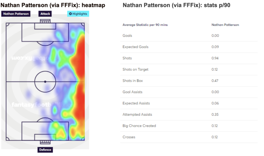 Patterson has had a comfortable introduction to PL life, and has confidently cemented his starting spot at RB/RWB. At 4.0m, Patterson offers a consistent stream of points with the potential for the odd CS + attacking return. 0.15 xGI p/90 for a 4.0m DEF asset is more than expected from someone of that price. Additionally, Patterson’s heatmap shows his ability to get down the right wing for EVE, but his presence in the box is limited. In my opinion, best set and forget DEF enabler asset.