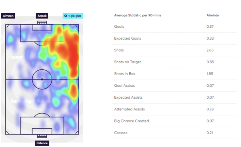 Almiron was the star budget option for the first half of the season picking up 93 pts over 15 games, the most of any MID. 8 goals. 2 assists, and 9 bonus points is incredible value for someone who started at 5.0m. Almiron has accumulated 0.4 xGI p/90 so far, taking 2.63 shots p/90, and 0.78 attempted assists p/90. 8 goals from 4.64 xG is overperforming, so I expect him to contribute less in the 2nd half of the season; however, at 5.8m, a nailed Almiron playing for an in-form NEW is a very exciting prospect. Almiron’s heatmap proves how he takes 1.85 SiB p/90, and I expect his penalty box presence to continue.
