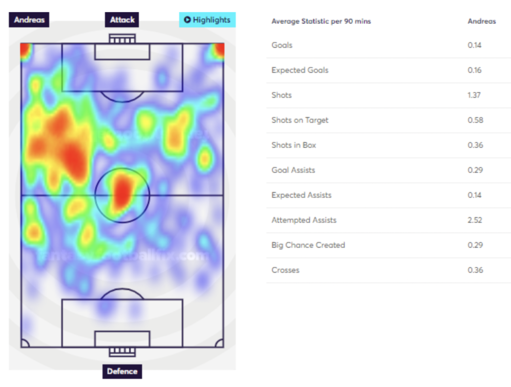 Andreas Periera (via FFFix): heatmap Andreas Periera (via FFFix): stats p/90