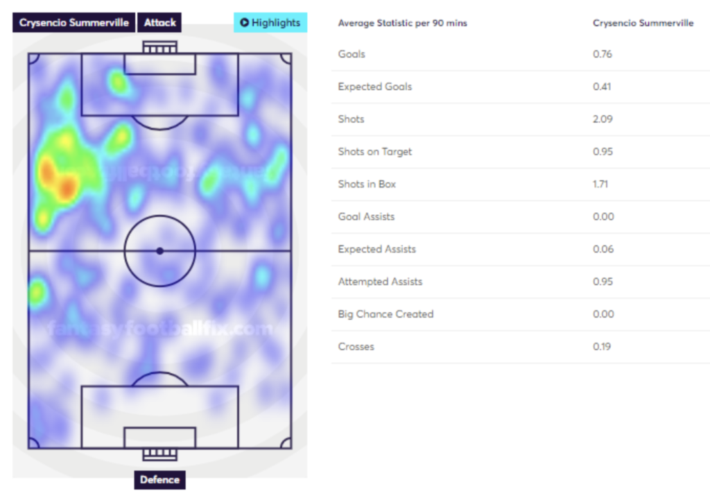 Crysencio Summerville (via FFFix): heatmap Crysencio Summerville (via FFFix): stats p/90