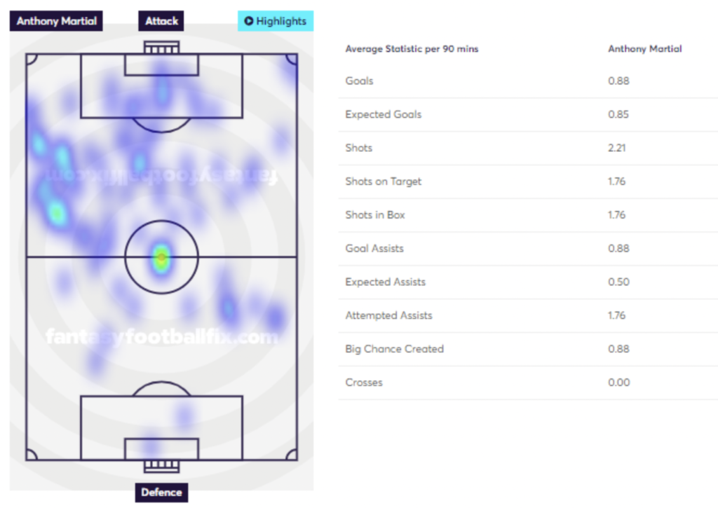 Anthony Martial (via FFFix): heatmap Anthony Martial (via FFFix): stats p/90