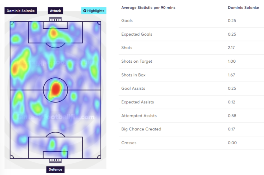 Dominic Solanke (via FFFix): heatmap Dominic Solanke (via FFFix): stats p/90