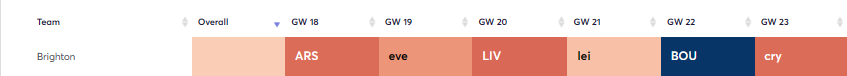 Even though Brighton’s fixtures are a little tricky, the possibility of a Double Gameweek in GW21(lei, CPL/bou) make them decent options.